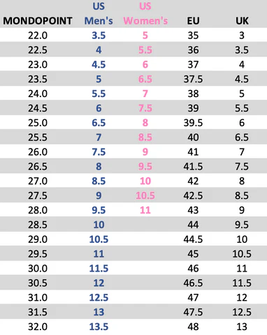さらに、サイズ表の中には、幅の狭いもの、通常のもの、広いものなど、幅のフィッティングを区別するものもあります。この点は、快適さとフィット感に大きな影響を与える可能性があるため、足の幅が広い人や狭い人にとって特に重要です。ブランドのサイズ表で特定の幅のオプションがあるかどうかを常に確認してください。